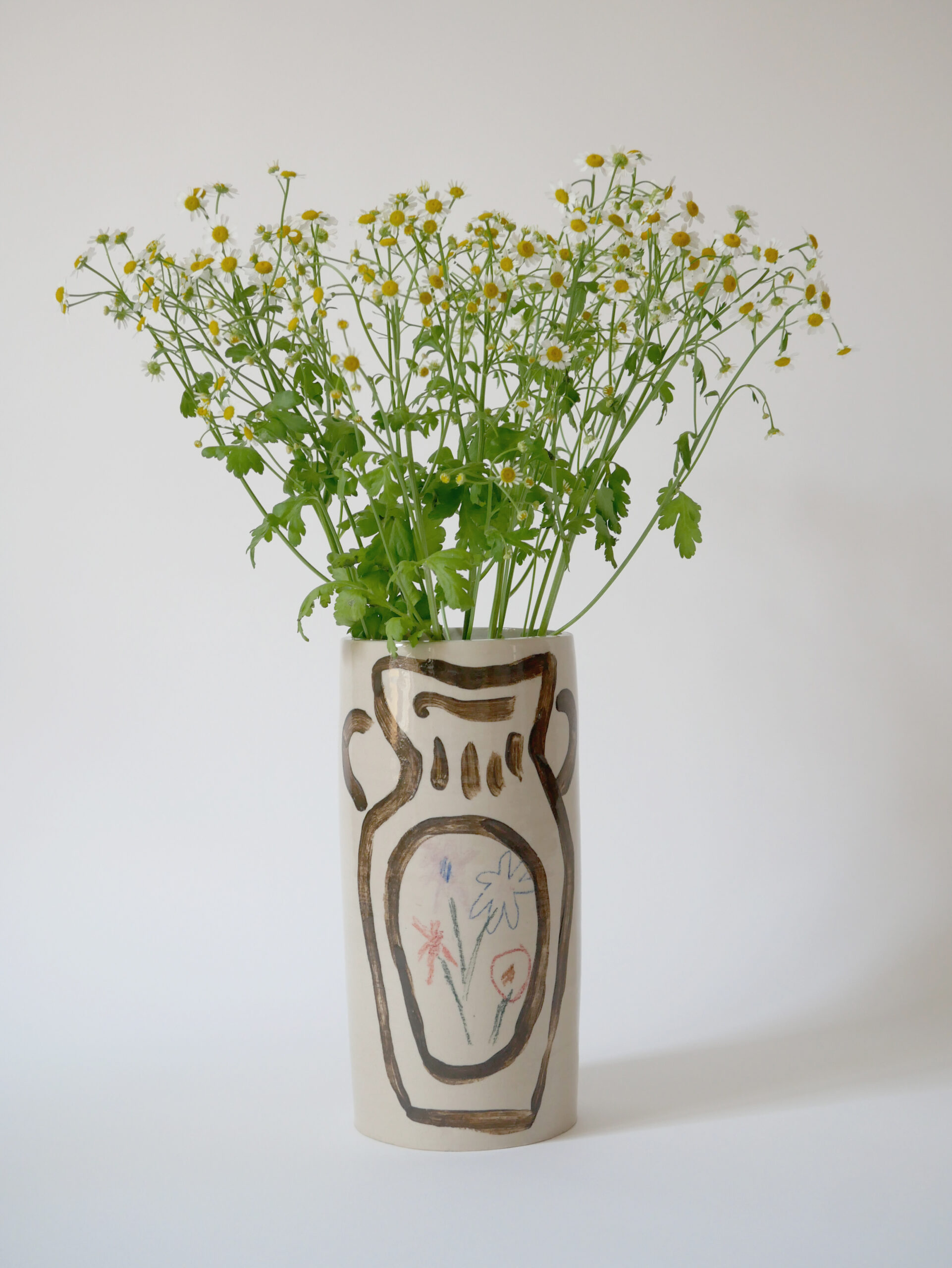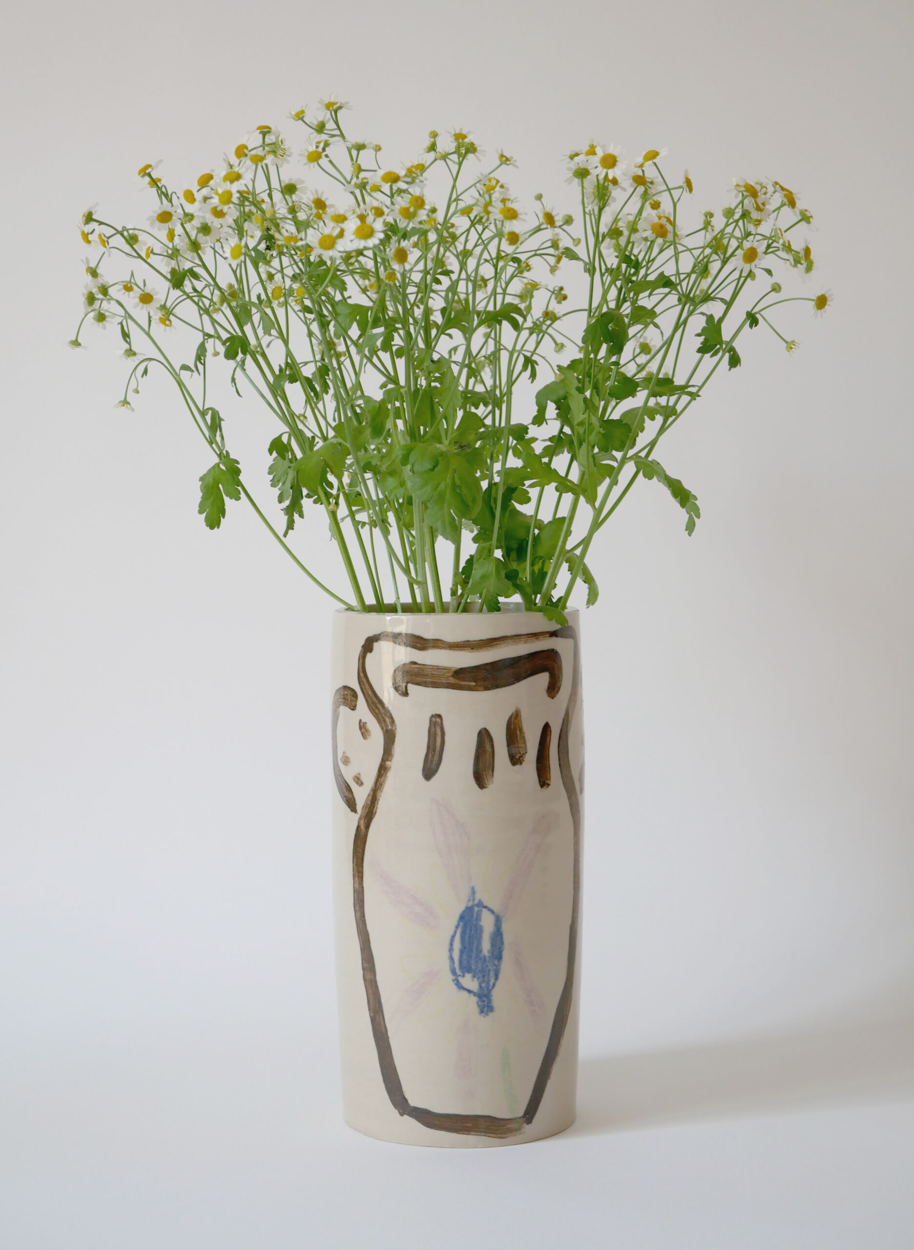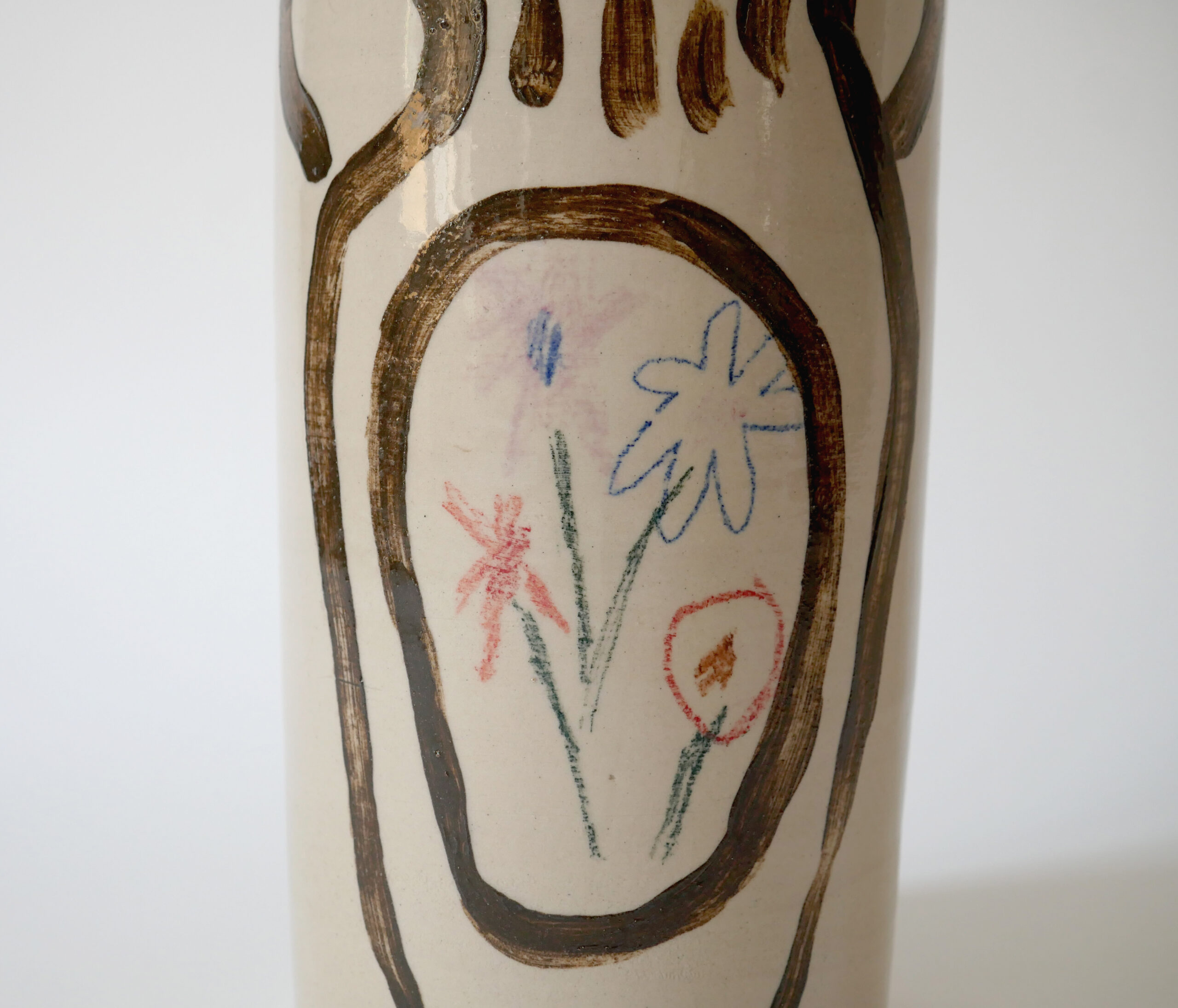 Ces pièces ont été réalisées par Benedicte Lacorre / Roche atelier , dans son atelier à Marseille . Ces pièces ont été tourné en grès et décorées par Clara Guilbert avec la technique de l’engobe, puis avec des craies et crayons. Il s’agit ici d’une rencontre entre la céramique et le dessin, le décoratif et le fonctionnel. Cette pièce est unique et non – reproductible.